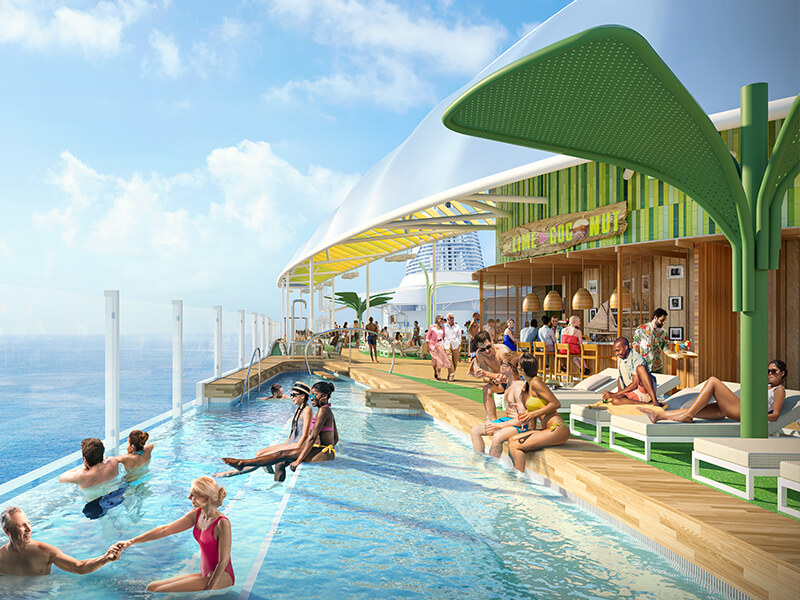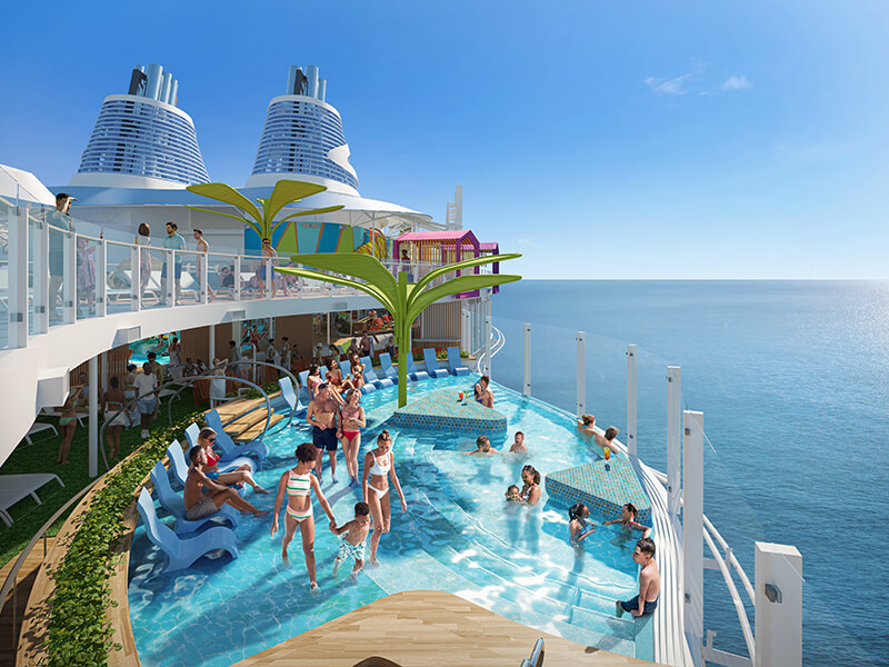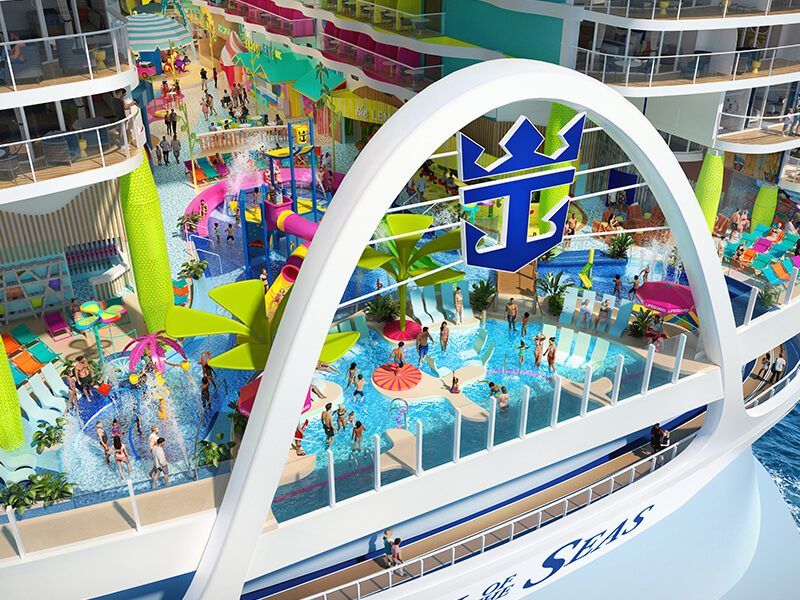 Doživite največji vodni park na morju s šestimi tobogani, uživajte v sedmih bazenih, vključno z osemnadstropnim bazenom Hideaway Pool ali območjem Hideaway Bay™ na Chill Island™, kjer se nahaja največji bazen na morju. Ste ljubitelj adrenalina? Thrill Island poskrbi za pravo dozo vznemirjenja. Ujemite popoln val na simulatorju surfanja FlowRider®. Preizkusite tudi svoj pogum na atrakciji Crown’s Edge – edinstveni kombinaciji skywalka, vrvnega poligona in adrenalinske vožnje. Medtem ko vi uživate v razgledih na območju Waters Edge, se lahko otroci zabavajo v sosednjem vodnem parku Splashaway Bay Aquapark™.